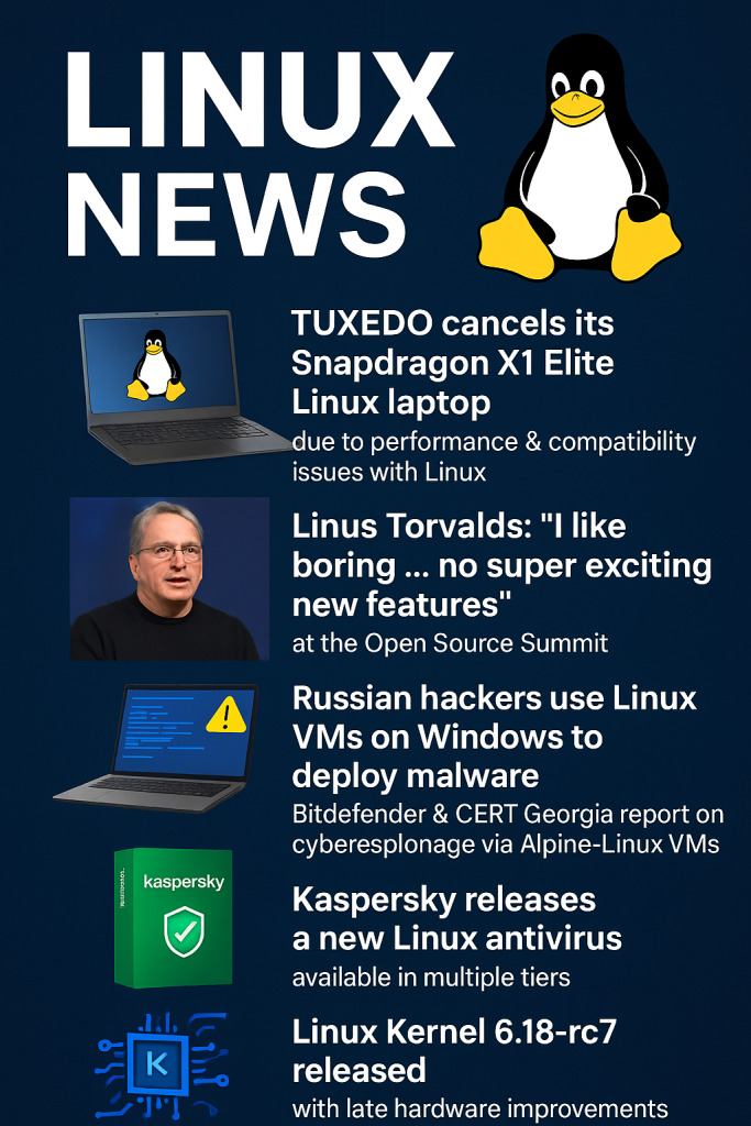 Curated headlines: TUXEDO, Linus Torvalds, Linux VMs in malware campaigns, Kaspersky Linux antivirus, and Linux Kernel 6.18 updates.