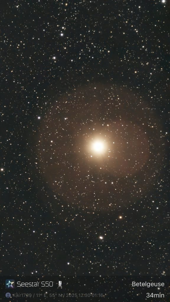 Betelgeuse er en af de mest kendte og iøjnefaldende stjerner på nattehimlen og findes i skulderen på stjernebilledet Orion. Den er en rød superkæmpestjerne (SuperNova) og ligger omkring 550 lysår fra Jorden. På billedet fremstår Betelgeuse som en glødende, orange-rød kugle, hvis farve afslører dens relativt lave overfladetemperatur sammenlignet med Solen, men også dens enorme størrelse.