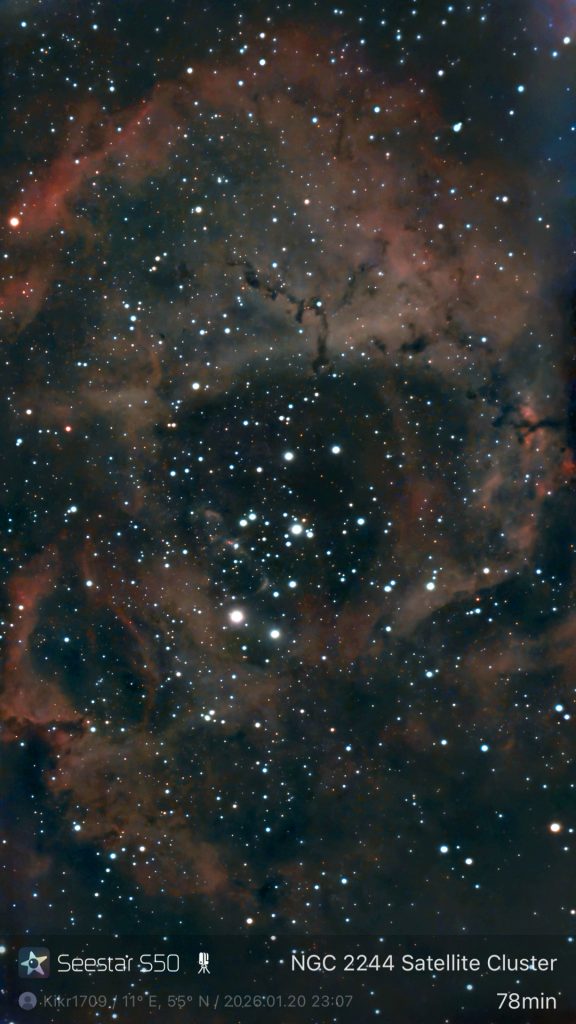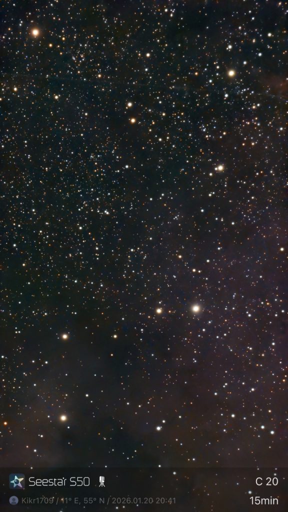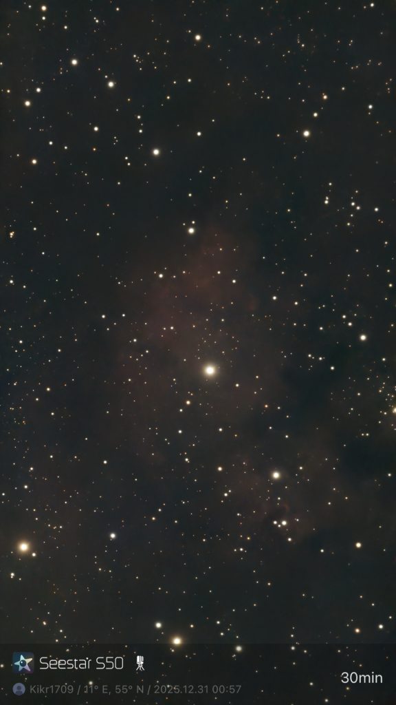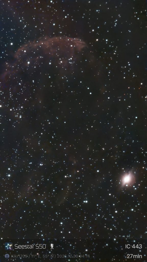 IC 443, ofte kaldet Vandmandstågen eller Jellyfish Nebula, er resterne af en voldsom supernovaeksplosion og repræsenterer et dramatisk kapitel i livscyklussen for massive stjerner. Objektet ligger omkring 5.000 lysår fra Jorden i stjernebilledet Tvillingerne (Gemini) og strækker sig over et stort område på himlen. På billedet fremstår IC 443 som et komplekst netværk af buede filamenter og glødende strukturer, der afslører chokbølgernes bevægelse gennem det omgivende rum.