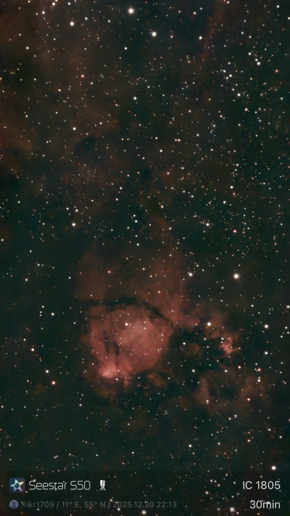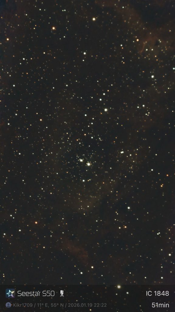 De rødlige og gyldne farvetoner skyldes primært ioniseret brint, som gløder under påvirkning af intens ultraviolet stråling fra unge, massive stjerner i området. Disse stjerner former aktivt deres omgivelser gennem kraftige stjernevinde, der skaber bobler, søjler og bølgende strukturer i tågen. I de mørkere områder findes tætte klumper af gas og støv, hvor nye stjerner stadig er ved at tage form, skjult for direkte observation. IC 1848 giver et fascinerende indblik i de voldsomme, men også livgivende processer, der driver stjernedannelse i Mælkevejen og former vores galaktiske omgivelser over millioner af år.