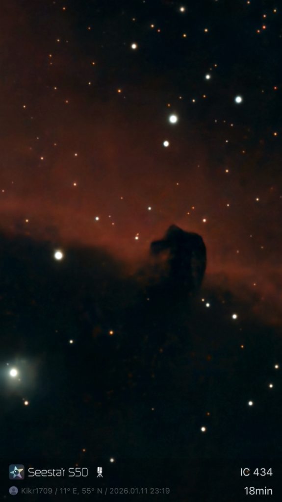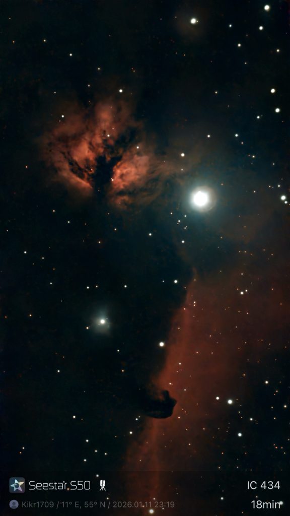 Den røde glød i IC 434 opstår, når brintgassen ioniseres af intens ultraviolet stråling fra den nærliggende, unge stjernegruppe omkring Sigma Orionis. Denne stråling får elektroner i brintatomerne til at udsende karakteristisk H-alfa-lys, som afslører subtile variationer i nebulosens tæthed og struktur. Selvom IC 434 ved første øjekast kan virke ensartet, viser detaljerede billeder fine filamenter, bølgende lag og bløde overgange mellem lysere og mørkere områder, som afspejler samspillet mellem stråling og gas.