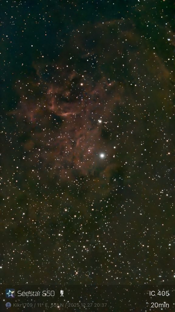 De røde farver stammer fra ioniseret brintgas, der lyser op under påvirkning af kraftig ultraviolet stråling, mens de blå nuancer opstår, når stjernelys reflekteres i fine støvpartikler. Kraftige stjernevinde former tågen i lange buer og flammelignende strukturer, som giver IC 405 sit karakteristiske udseende. Inde i de mørkere områder gemmer sig tætte skyer af gas og støv, hvor nye stjerner kan være under dannelse. IC 405 er et fascinerende eksempel på samspillet mellem unge, energirige stjerner og det interstellare materiale, som både bliver formet, oplyst og gradvist nedbrudt af stjernernes stråling.