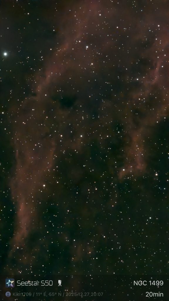 NGC 1499, bedre kendt som Californienebulosen, er en stor og spektakulær emissionsnebulose, der ligger omkring 1.000 lysår fra Jorden i stjernebilledet Perseus. Nebulosen har fået sit navn, fordi dens langstrakte form på himlen minder om omridset af den amerikanske delstat Californien. På billedet fremstår den som en glødende sky af gas, der strækker sig over et stort område og kun afslører sine detaljer tydeligt gennem lange eksponeringer eller smalbåndsfiltre.