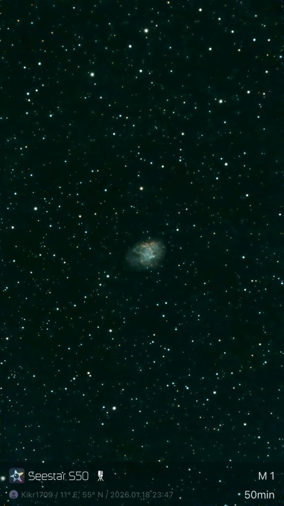 M1, bedre kendt som Krabbetågen, er resterne af en voldsom supernovaeksplosion, der blev observeret af kinesiske og arabiske astronomer i år 1054. Objektet ligger omkring 6.500 lysår fra Jorden i stjernebilledet Tyren og repræsenterer et af de mest studerede supernovarester i astronomien. På billeder fremstår M1 som et komplekst og energifyldt netværk af filamenter, der stråler ud i rummet og vidner om den eksplosive begivenhed, som skabte tågen.