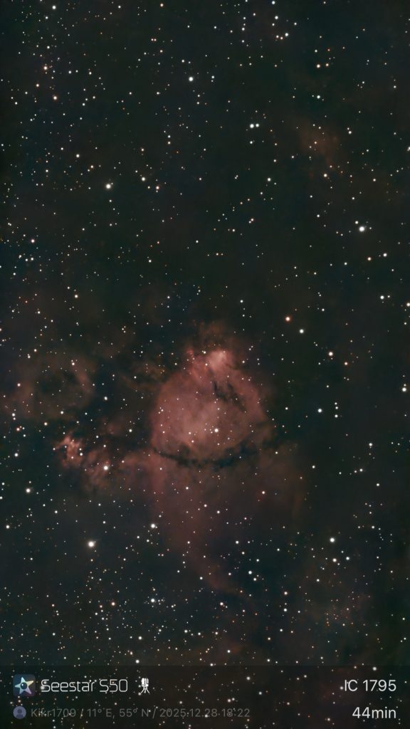 De rødlige nuancer skyldes brintgas, som lyser op, når den bestråles af kraftigt ultraviolet lys fra unge, varme stjerner i området. Disse stjerner er netop blevet født ud af de tætte skyer af gas og støv og påvirker aktivt deres omgivelser. Stjernevinde og stråling presser materialet væk, skaber bølgende strukturer og kan samtidig udløse dannelsen af nye generationer af stjerner. Mørke søjler og uregelmæssige former i nebulosen afslører, hvor det tætte støv stadig skjuler sig mod lyset. IC 1795 giver et fascinerende indblik i de dynamiske og voldsomt energirige processer, der former stjerner og planetsystemer i vores galakse.