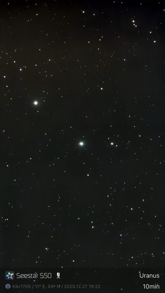 Uranus er den syvende planet fra Solen og skiller sig ud som en af Solsystemets mest usædvanlige verdener. Den ligger i gennemsnit omkring 2,9 milliarder kilometer fra Solen og tilhører gruppen af såkaldte isgiganter, sammen med Neptun. På billedet fremstår Uranus som en rolig, blågrøn kugle, hvis farve skyldes metan i atmosfæren, der absorberer det røde lys og lader de blå nuancer dominere.