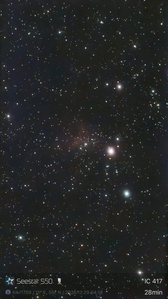 IC 417 er en lysstærk emissionsnebulose beliggende omkring 6.000 lysår fra Jorden i stjernebilledet Kusken (Auriga). Nebulosen er en del af et aktivt stjernedannende område i Mælkevejen og forbindes ofte med stjernehoben Stock 8, som ligger indlejret i den glødende gas. På billedet fremstår IC 417 som en kompleks sky af lysende gas, gennembrudt af mørke støvstrukturer og formet af de kraftige kræfter fra unge, massive stjerner.
