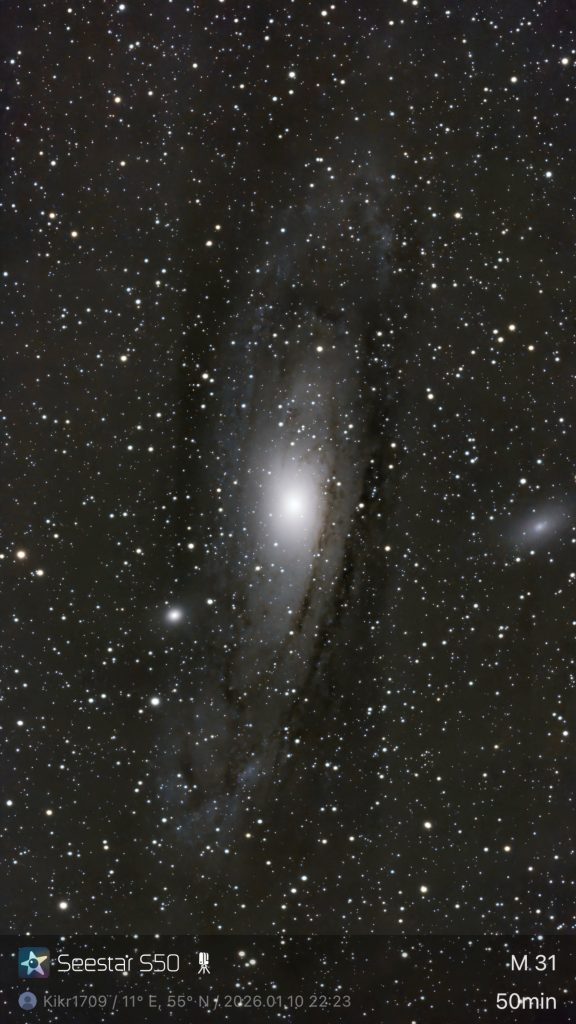 M31, bedre kendt som Andromedagalaksen, er den nærmeste store nabogalakse til Mælkevejen og ligger omkring 2,5 millioner lysår fra Jorden. Den er så stor, at den strækker sig over et område på himlen, der er flere gange større end fuldmånen, selvom dens lys er svagt for det blotte øje. På billedet ses galaksen let skråt, hvilket giver et imponerende overblik over dens langstrakte form og komplekse struktur.