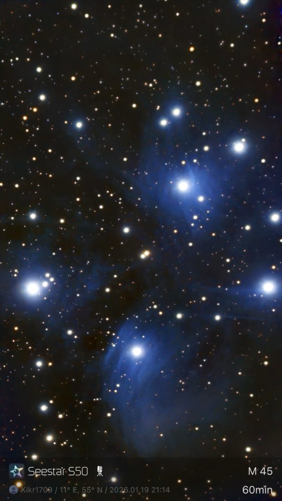 M45, bedre kendt som Plejaderne eller Syvstjernen, er en af de mest iøjnefaldende og letgenkendelige stjernehobe på nattehimlen. Den ligger omkring 440 lysår fra Jorden i stjernebilledet Tyren (Taurus) og er synlig for det blotte øje som en lille, tæt gruppe af klare stjerner. På billeder fremstår M45 som en samling af intense, blåhvide stjerner indlejret i fine, sløragtige strukturer af støv, der giver hoben et næsten æterisk udseende.