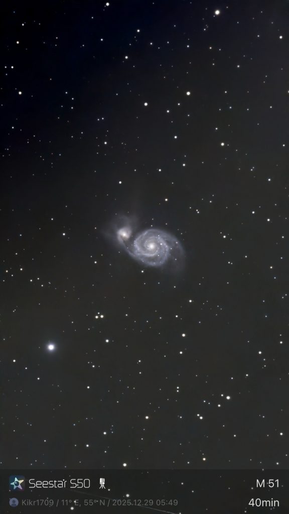 M51, kendt som Hvirvelgalaksen, er en af de mest ikoniske spiralgalakser på nattehimlen og ligger cirka 23 millioner lysår fra Jorden i stjernebilledet Jagthundene. Galaksen ses næsten direkte fra oven, hvilket gør dens spiralarme usædvanligt tydelige. I centrum lyser en kompakt kerne, omgivet af spiralarme, der snor sig dramatisk ud i rummet og giver galaksen sit karakteristiske hvirvlende udseende.
