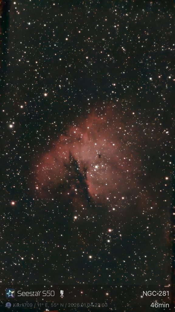 NGC 281, ofte kendt som Pacman-nebulosen, er et markant stjernedannende område beliggende omkring 9.500–10.000 lysår fra Jorden i stjernebilledet Cassiopeia. Nebulosen har fået sit populære navn, fordi dens overordnede form på billeder kan minde om den klassiske figur fra computerspillet, men bag den karakteristiske silhuet gemmer sig et komplekst og energirigt kosmisk miljø. NGC 281 er en del af et større kompleks af gas og støv, der befinder sig højt over Mælkevejens galaktiske plan.