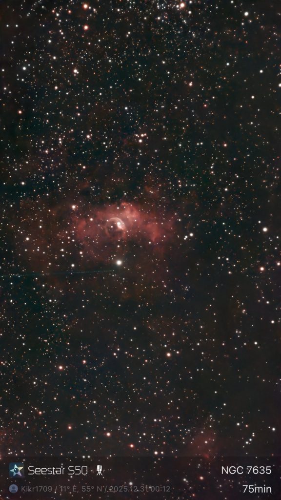 NGC 7635, bedre kendt som Bobletågen (Bubble Nebula), er en spektakulær emissionsnebulose beliggende omkring 11.000 lysår fra Jorden i stjernebilledet Cassiopeia. Nebulosen er berømt for sin næsten perfekt kugleformede boble, som står i skarp kontrast til det omgivende kaotiske netværk af gas og støv. På billedet fremstår boblen som en lysende skal, der ser ud til at svæve i et større stjernedannende område.