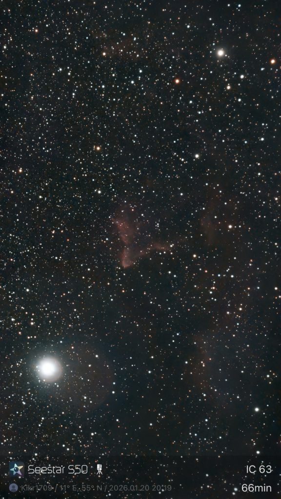 IC 63 giver et sjældent og detaljeret indblik i samspillet mellem en massiv stjerne og dens omgivelser på relativt kort kosmisk afstand. Nebulosen illustrerer, hvordan stjernelys både kan oplyse, forme og gradvist nedbryde de skyer af gas og støv, som udgør råmaterialet for fremtidige stjerner i Mælkevejen.